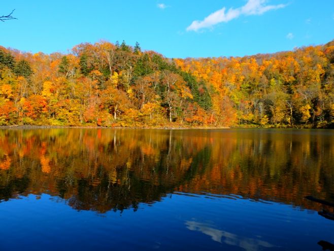 湖畔へは駐車場から整備された遊歩道を10〜15分ほど歩いてアクセスします。木立の中を抜ける散策路は、春の新緑、夏の深い緑、秋の紅葉と、季節ごとに表情を変え、歩くだけでも心が整う時間を味わえます。湖面は穏やかで、風のない日には周囲の森が水面に映り込み、幻想的な景色が広がります。